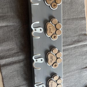 - **Fully personalised** 🐾 – laser-etched with your dog’s name + paw print in playful script (no stickers, no peeling) - **Choose 1–5 sturdy metal hooks** 🪝 – perfect for leads, collars, treat bags & keys -